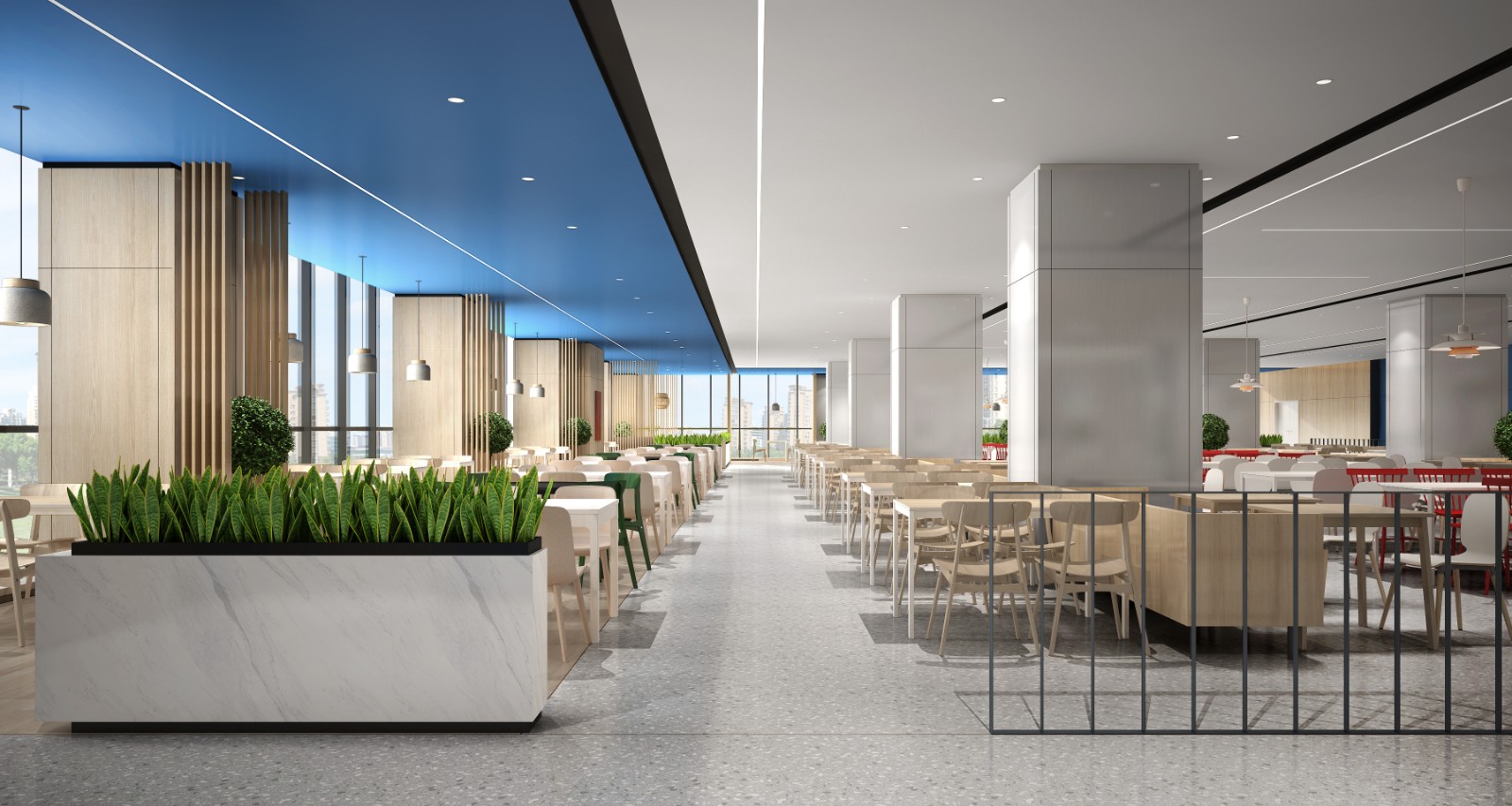 月牙泉攝人心魄的美麗在其夜、在其藍,金楓設計提取“月夜藍”的元素,融入員工餐廳設計中。采用環保的藍色有機涂料來打造天花,綴以不規則的小型頂燈,營造出浪漫瑰麗的月泉夜晚圖景,使就餐者恍若置身月泉畔,縱享湖光月色。