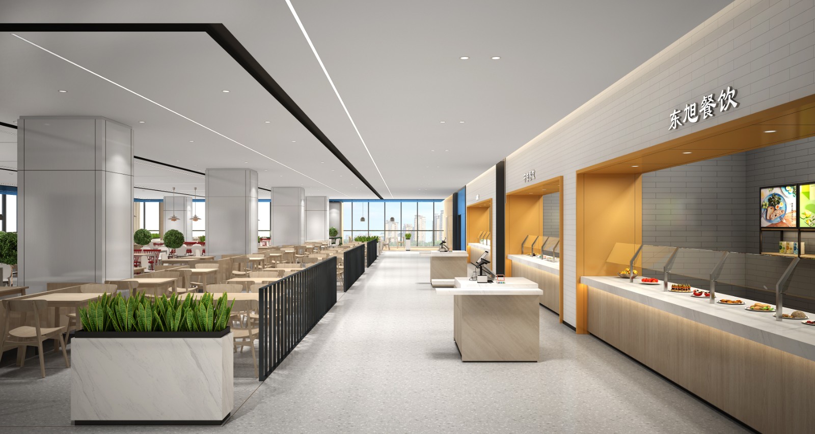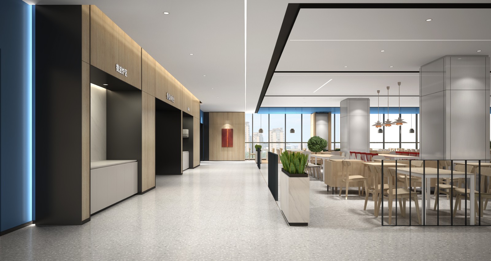 如果說臨窗的就餐區是月泉浪漫的星夜,橙色的檔口區模擬溫暖的夕陽,那么中間的餐區就是代表科技的沙漠綠洲。金屬材質現代科技感十足,木質桌椅溫潤自然,大盆綠植規律擺放,搭配錯落有致。中間的紅色座椅區仿佛熱烈燃燒的火焰,代表強烈的生命力與創造力。銀色的立柱磅礴大氣,整個空間自由開闊,彰顯著企業不凡的品味與格局。微波爐區與餐盤回收傳送帶的設置十分人性化,在力求簡約舒適之余,為企業提供精致但實用的員工餐廳設計。