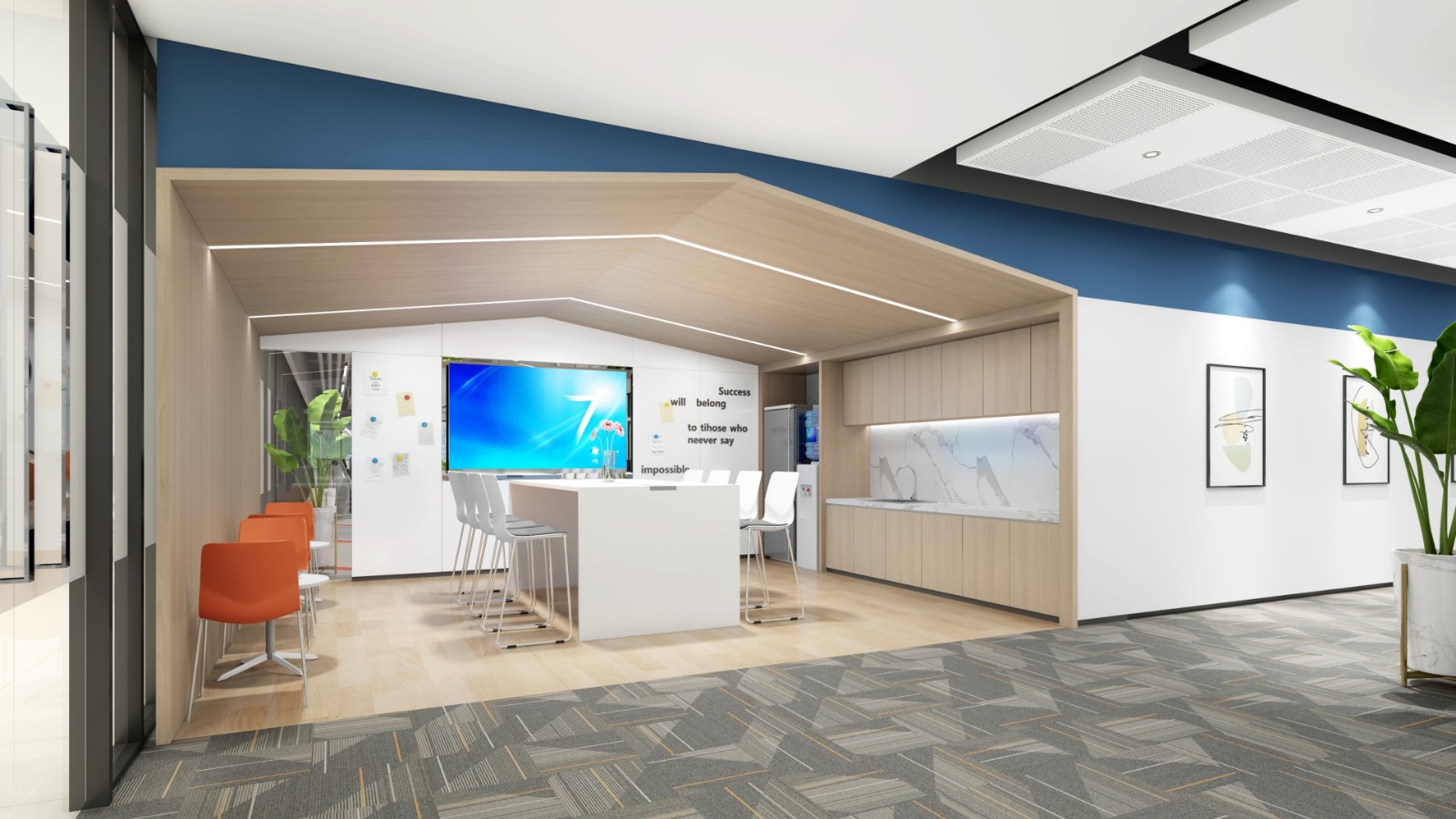 ? 清晰的棱角線,在墻體中鑲嵌出一個水吧,并配備顯示大屏,滿足休閑式的會議交流需求,突破了傳統(tǒng)休憩區(qū)的單一功能。